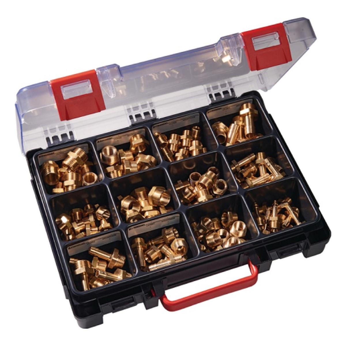 Obsežna garnitura z 120 različnimi spojkami za zanesljivo povezovanje cevi in navojnih komponent v pnevmatskih in hidravličnih sistemih. Vsebuje širok nabor dimenzij za profesionalno uporabo v industriji ali delavnici.