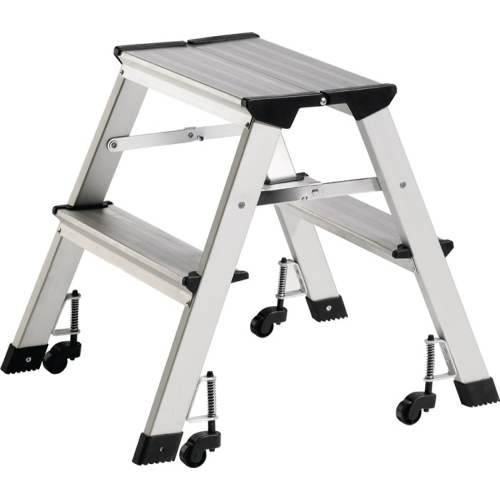 Kolesa se obračajo za 360°, kar omogoča hitro in enostavno pozicioniranje stopnic, tudi v ozkih ali zasedenih prostorih. Nedrseče noge in rebraste proti-zdrsne stopnice dodatno pripomorejo k varnosti pri delu na višini.