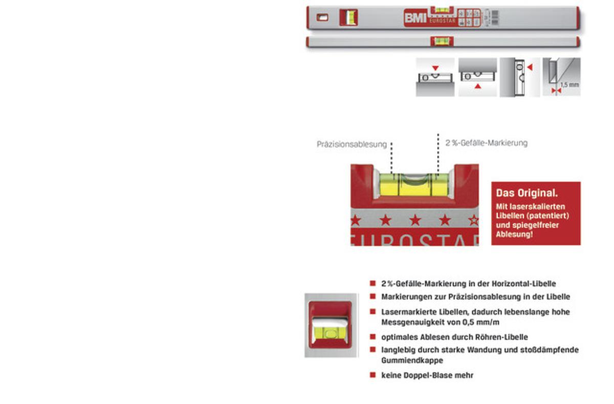 - Libellenblasen machen bei gleicher Schräglage einen 5× weiteren Weg als herkömmliche Wasserwaagen
