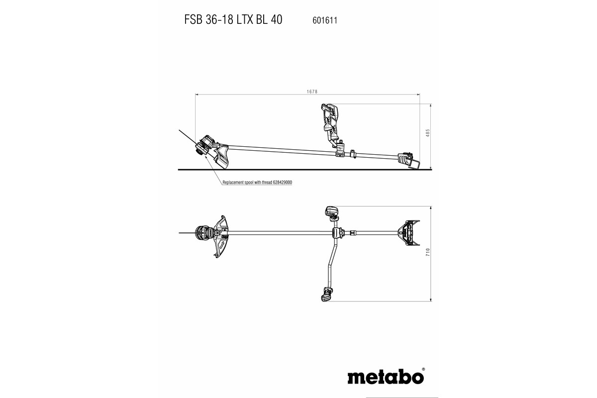 Dvo-ročni ročaj, Hrbtni nosilni trak, Zaščitni pokrov, Glava kose z dvema nitkama (nitka O 2 mm, 4 m), 3-kraki nož kose, Vmesnik za nože, Kombinirani ključ, Zaporni zatič, brez baterijskega paketa in polnilca