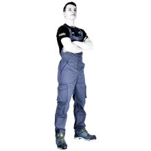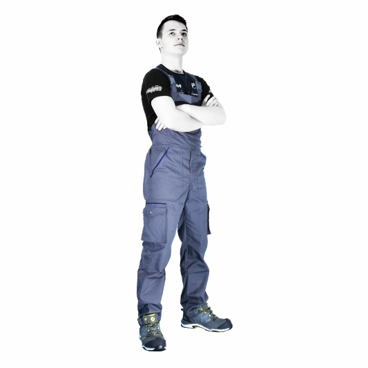 Delovne hlače na naramnice- Kvalitetne delovne hlače z nastavljivimi naramnicami, veliko žepi in z elegantnimi temno modrimi dodatki na robovih žepov- Velik priročen sprednji žep na gumb- Material: 35% bombaž in 65% poliester- Barva: Siva- Teža: 245 g/m²