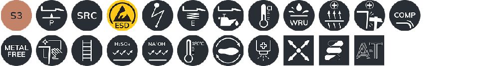 Čevlji nudijo zaščito razreda S3, odpornost na vodo, gorivo, kisline, baze in vročino do 180 °C. Nedrseč podplat omogoča varen vzpon po lestvah.