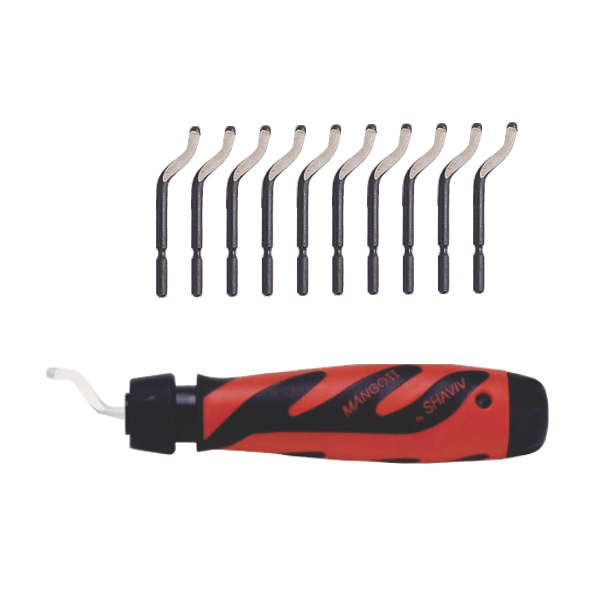 Držalo MANGO II nove generacije je ergonomsko oblikovano orodje za učinkovito in udobno posnemanje robov. Komplet vključuje 10 nožev E100, ki so primerni za obdelavo različnih materialov, kot so jeklo, aluminij, baker in plastika.