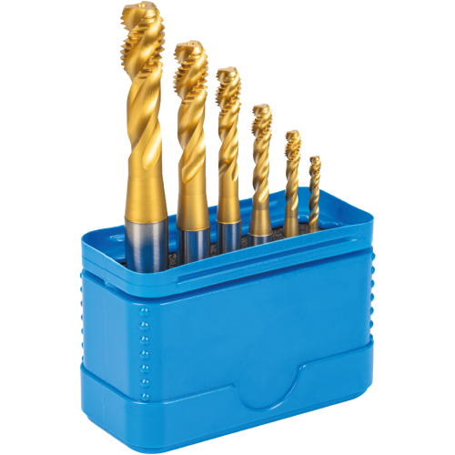6-delna garnitura navojnih svedrov je namenjena natančni izdelavi slepih navojev (Grundlochgewinde) v različnih kovinah in zlitinah. Svedri so izdelani iz visokokakovostnega hitroreznega jekla (HSS) z dodatkom vanadija in prevlečeni s TiN (Titanium Nitride), kar zagotavlja daljšo življenjsko dobo, manj trenja in visoko kakovost navojev.