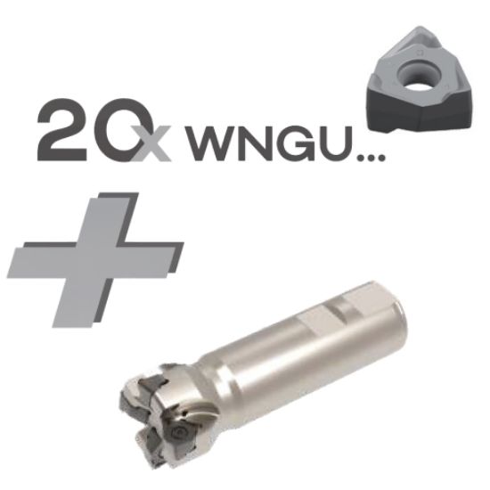 Garnitura ASM90-050 združuje visoko zmogljivo rezkalno glavo premera 50 mm in komplet 20 rezalnih ploščic WNGU 0806, kar omogoča natančno 90° čelno in ramensko rezkanje z izjemno stabilnostjo in kakovostjo obdelane površine. Orodje je zasnovano za zanesljivo obdelavo jekla, nerjavnega jekla in litega železa pri visokih hitrostih rezanja ter zagotavlja učinkovito odvajanje odrezkov in dolgo življenjsko dobo ploščic.