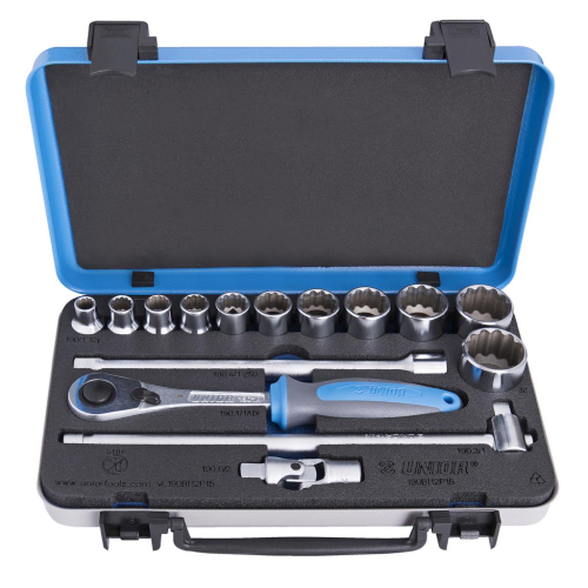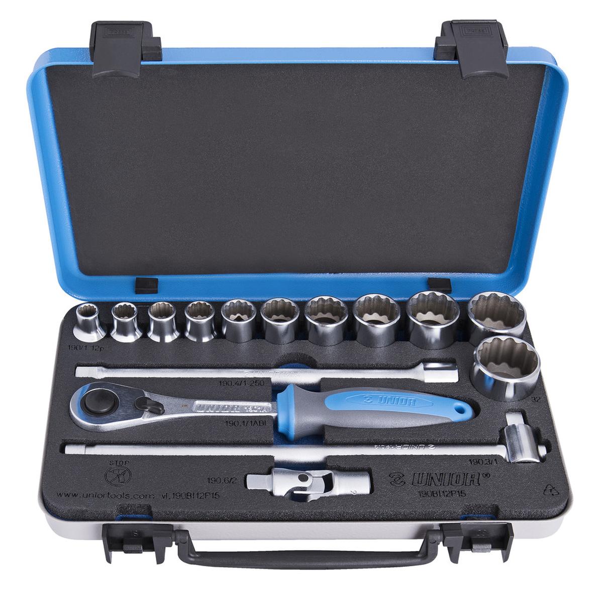 Set vsebuje:11x nasadni ključ 1/2", 12 kotni (artikel 190/1 12P)dim. 10, 12, 13, 14, 17, 19, 22, 24, 27, 30, 32. 1x dvosmerna raglja 1/2". Pribor 1/2"; 1x T ročica, 1x podaljšek (250 mm), 1x kardanski zglob.