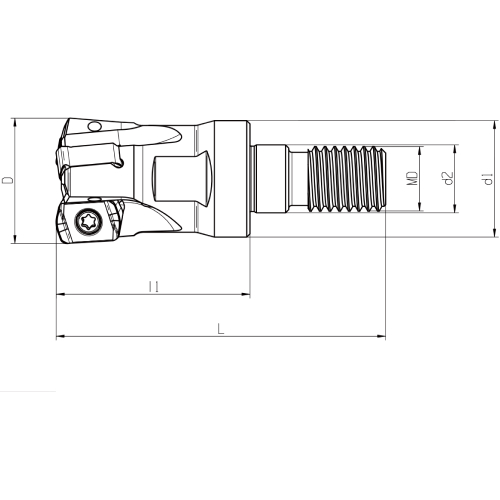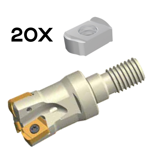 Garnitura vključuje robustno rezkalno glavo z večmestnim vpetjem in 20 visokozmogljivih rezalnih ploščic tipa LNMX. Sistem je zasnovan za grobo in srednje fino rezkanje, kjer sta pomembni stabilnost in učinkovitost pri večjih odvzemih materiala. Geometrija LNMX zagotavlja tiho delovanje, enakomerno obrabo in dolgo življenjsko dobo ploščic.