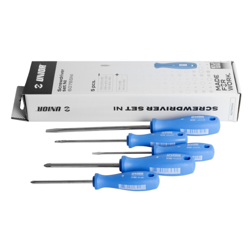 Uniorjeva garnitura 607 B5 vsebuje pet kakovostnih izvijačev, ki so namenjeni profesionalni in domači uporabi. Odlikuje jih robustna izdelava, dolga življenjska doba in udobno rokovanje.
