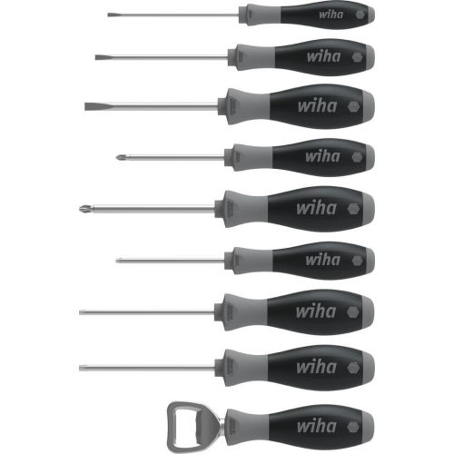 WIHA SoftFinish 9-delna garnitura izvijačev vključuje Schlitz, Phillips in TORX® izvedbe, zasnovane za natančno in učinkovito delo. Različne velikosti ročajev so prilagojene posameznim vrstam opravil: tanek in podolgovat ročaj omogoča hitro in varno privijanje manjših vijakov, medtem ko večji, ergonomski ročaj zagotavlja višje navore pri večjih vijakih.