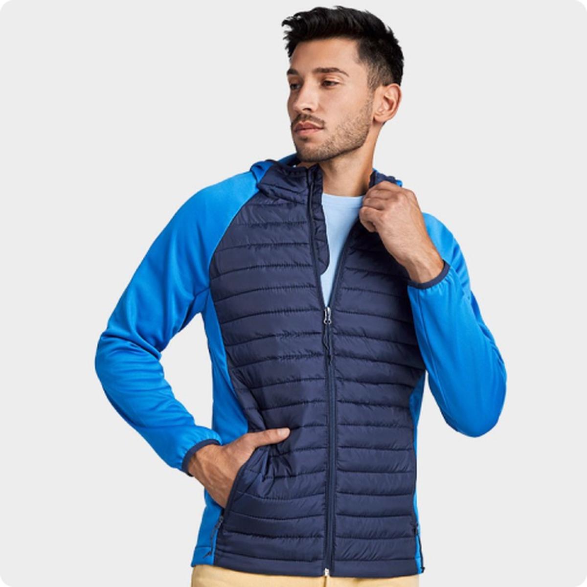 Sodoben model moške jakne, izdelane iz kombinacije materialov za funkcionalnost, toploto in gibljivost.