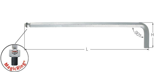 Dolgi imbus ključ z krogljično glavo po standardu DIN/ISO 2936L, izdelan iz kakovostnega krom-vanadijevega jekla.