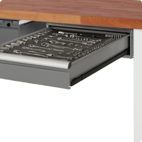 Delovna miza je opremljena z dva podstavljena predala dimenzij 520 x 650 x 175 mm, od tega en predal velikosti L z notranjo višino 150 mm. Notranje dimenzije predala so 490 x 560 mm, nosilnost predala je 50 kg. Predali imajo kroglična izvlečna vodila z 90 % izvlekom, predalna korita pa so popolnoma zaprta za optimalno uporabo organizatorjev predalov.