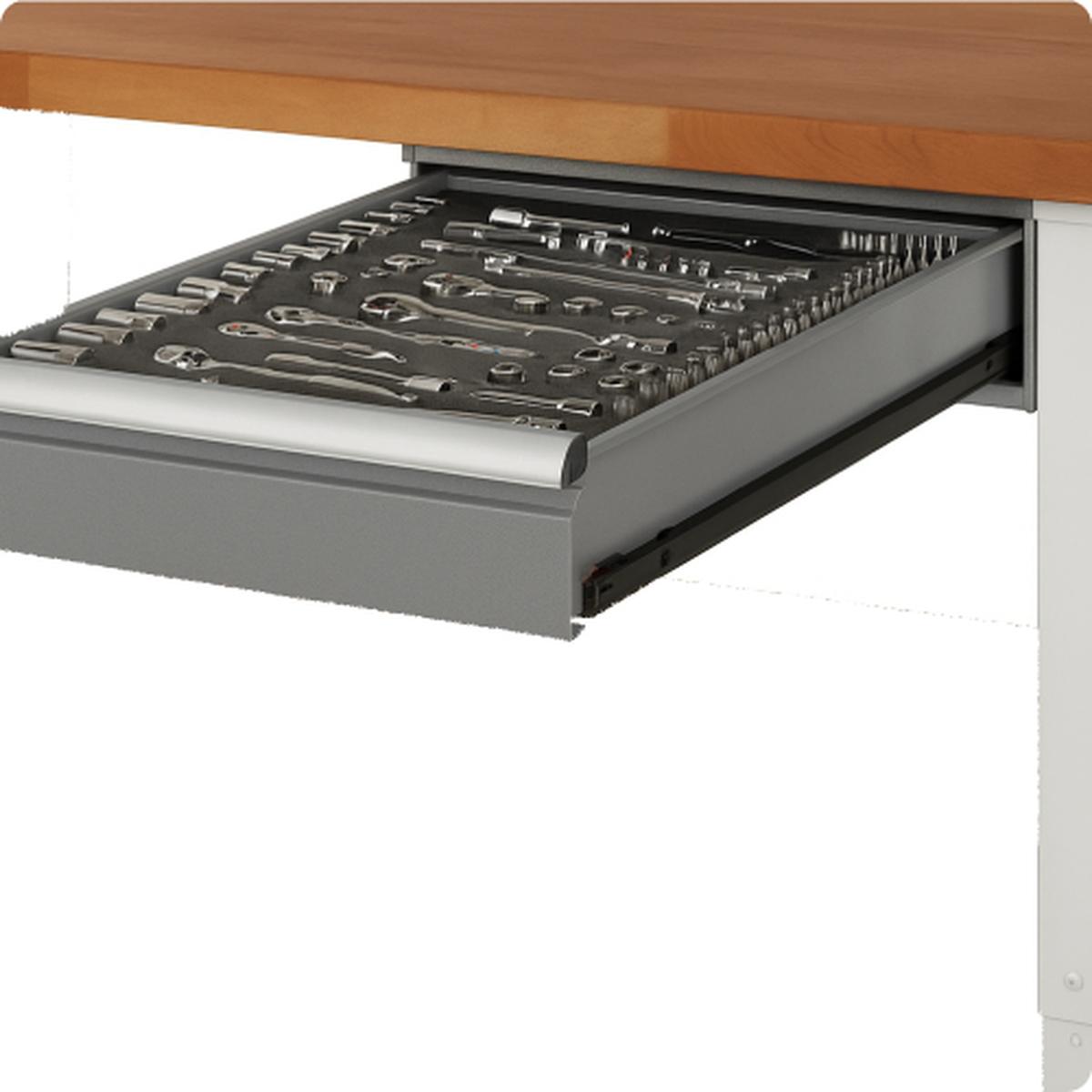 Delovna miza ima dva podstavna predala dimenzij 520 x 650 x 175 mm, od tega en predal z notranjo višino 150 mm. Predali so opremljeni s kakovostnimi krogličnimi izvlečnimi vodili z 90 % izvlekom in so popolnoma zaprti za optimalno zaščito in možnost organizacije orodij.