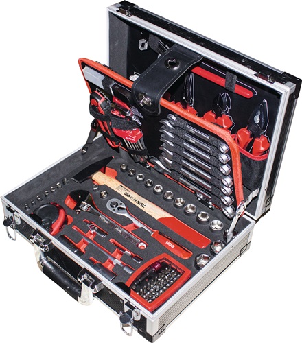 Garnitura vključuje ročno orodje, nasadne nastavke, klešče, izvijače, merilno opremo in dodatke, organizirane v kovčku za pregledno shranjevanje.