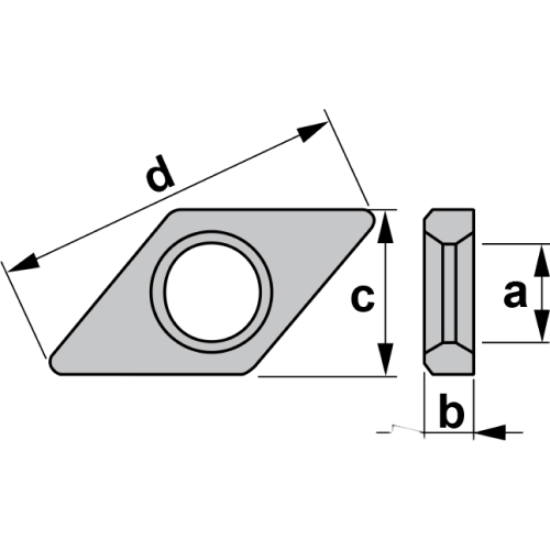 Podložna ploščica z rombasto geometrijo 55° je zasnovana posebej za stružne ploščice in držala tipa DN** (npr. DNMG, DNGG, DNMA). Zagotavlja pravilno podporo in stabilno sedežno površino, kar je ključno za natančno obdelavo in manjšo obrabo rezalnega roba.