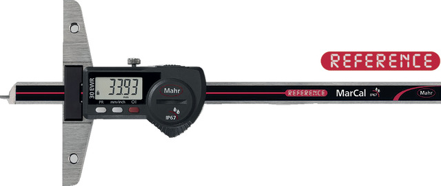 - 2 Messflächen: Der Messstift darf entnommen werden, hierfür ist die Stirnseite der Tiefenmessstange als Messfläche ausgebildet und der Maßstab mit Folie, gesichert gegen Beschädigungen, zurückgesetzt