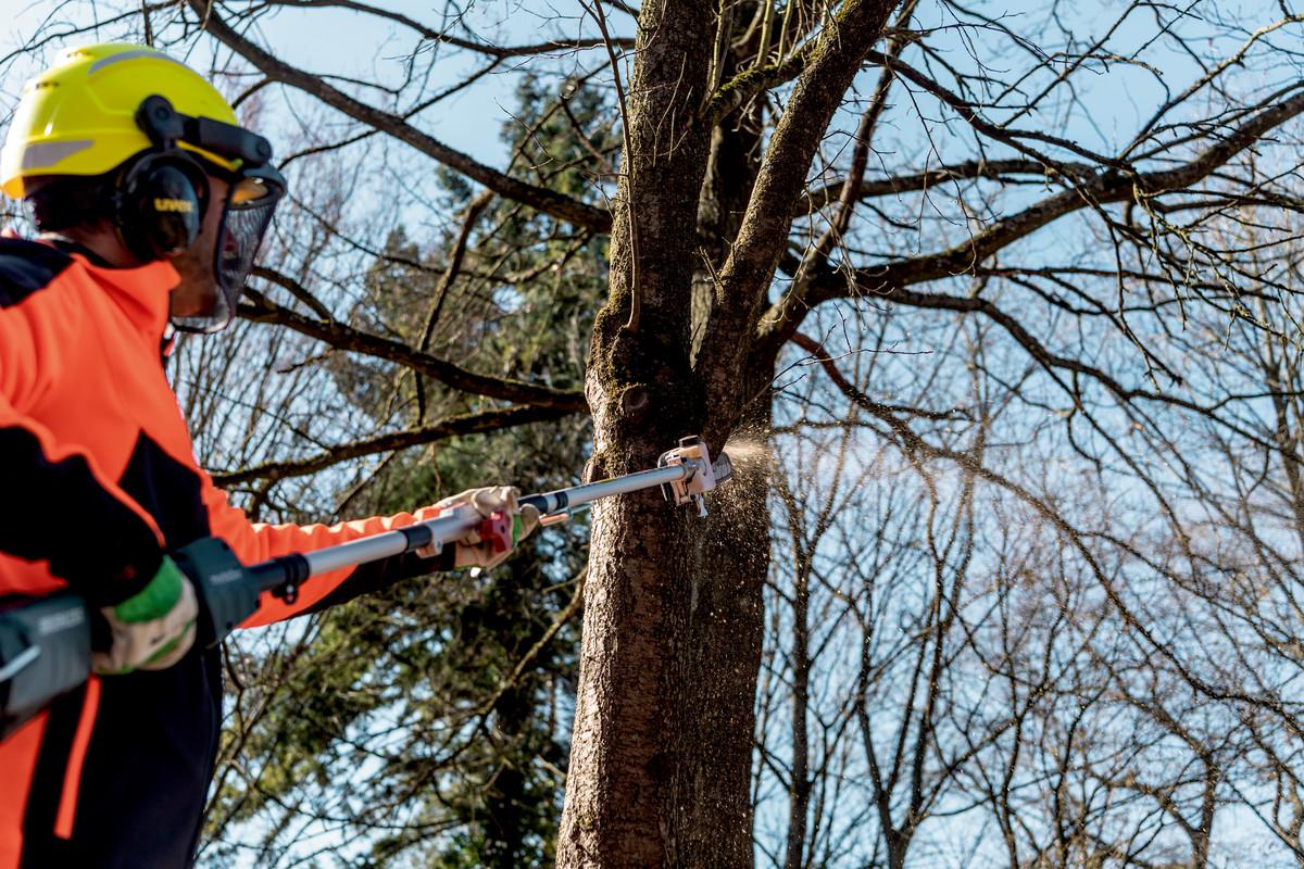 Varna nega dreves s priključkom za visoko obrezovanje večnamenskega sistema Metabo, rešitev "vse v enem" za številna vrtnarska opravila