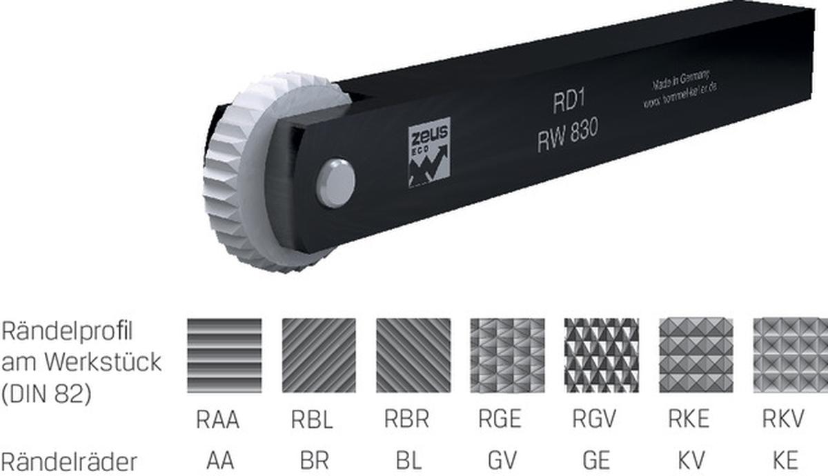 Rändelformen (spanlose Umformung). Einstichrändelung (Längsrändelung RAA, RBL und RBR möglich). Für alle Rändelmuster, Profile und Beschriftungen. Alle Rändelradformen verwendbar. Für Drehautomaten und -maschinen sowie konventionelle Drehmaschinen.