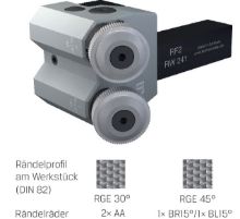 Rändelfräsen (spanabhebende Umformung), Längsrändelung. Für Rändelungen am Werkstück nach DIN 82: RGE 30, RGE 45. Für Drehmaschinen und Drehautomaten, CNC und konventionell. Schaftoberkante = Spitzenhöhe. Hohe Stabilität durch Verzahnung zwischen Werkzeughalter und Rändelfräskopf. Hartmetall-Laufbuchsen. Spezielle Oberflächenhärtung für erhöhte Verschleißfestigkeit.