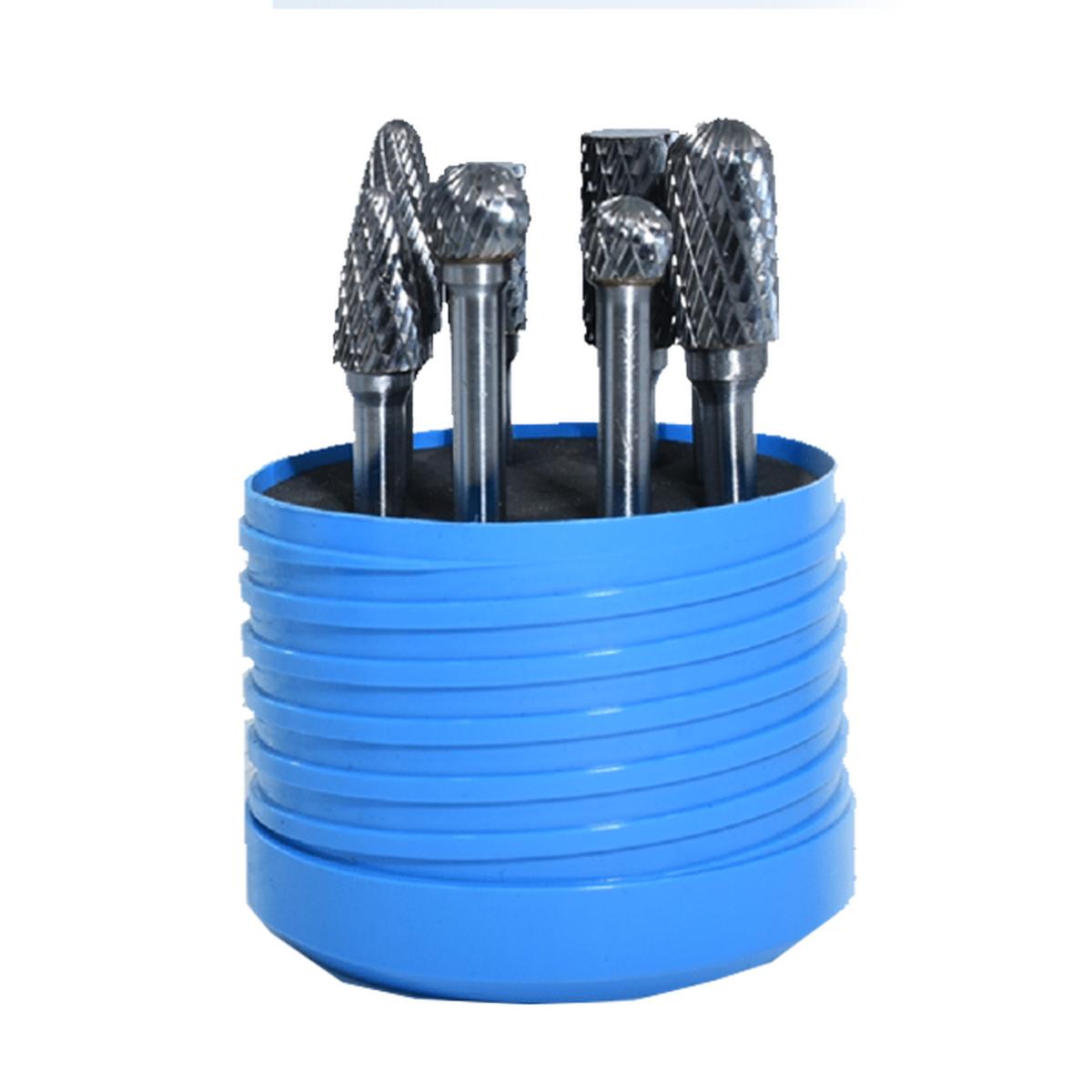 8-delna garnitura roto-rezkarjev iz karbidne trdine z 6 mm vpenjalom in križnim ozobljenjem, pakirana v plastični škatli.