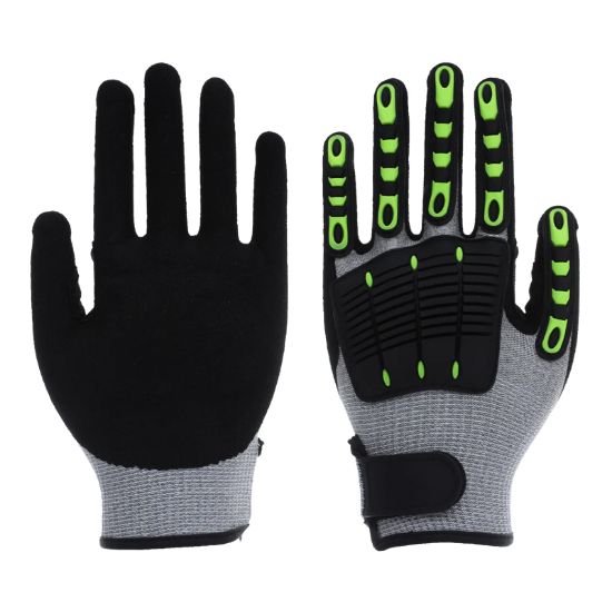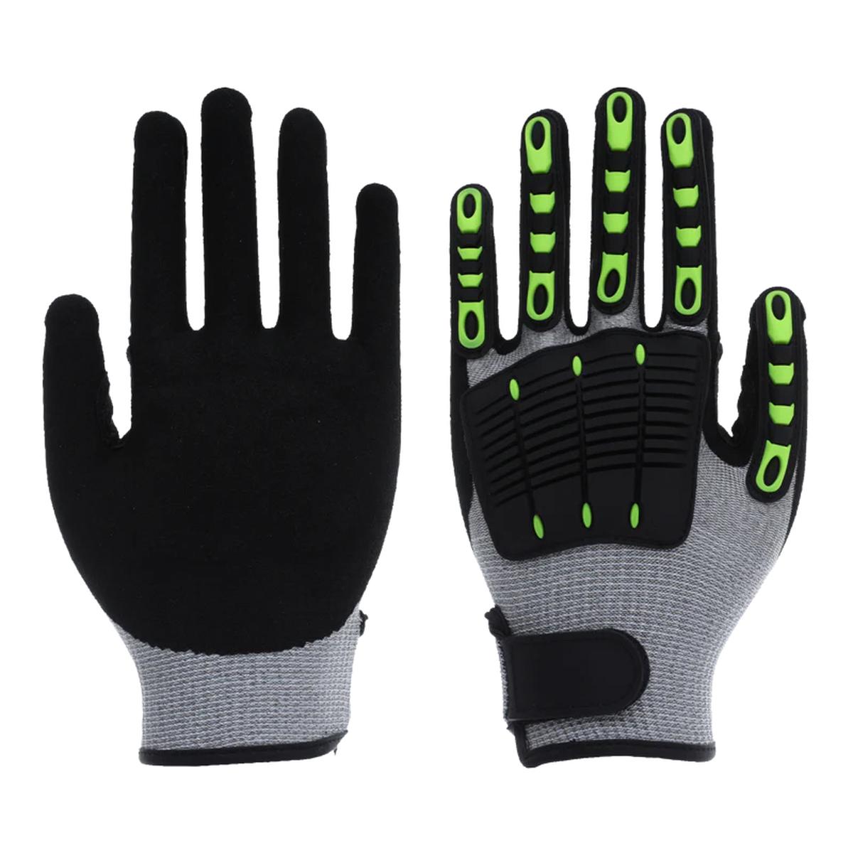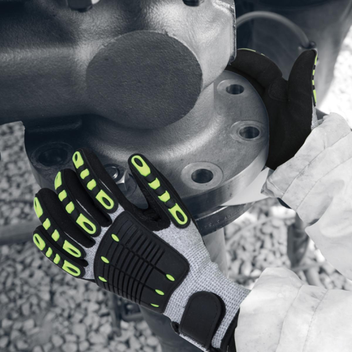 Na hrbtni strani roke in prstov je vgrajena zaščita iz TPE (termoplastični elastomer), ki absorbira udarce in ščiti pred stiskanjem. Posebni blažilni vložki na dlani zmanjšujejo obremenitev pri uporabi pete roke, medtem ko sandy nitrilni premaz omogoča odličen oprijem tudi v mokrih in oljnih pogojih.