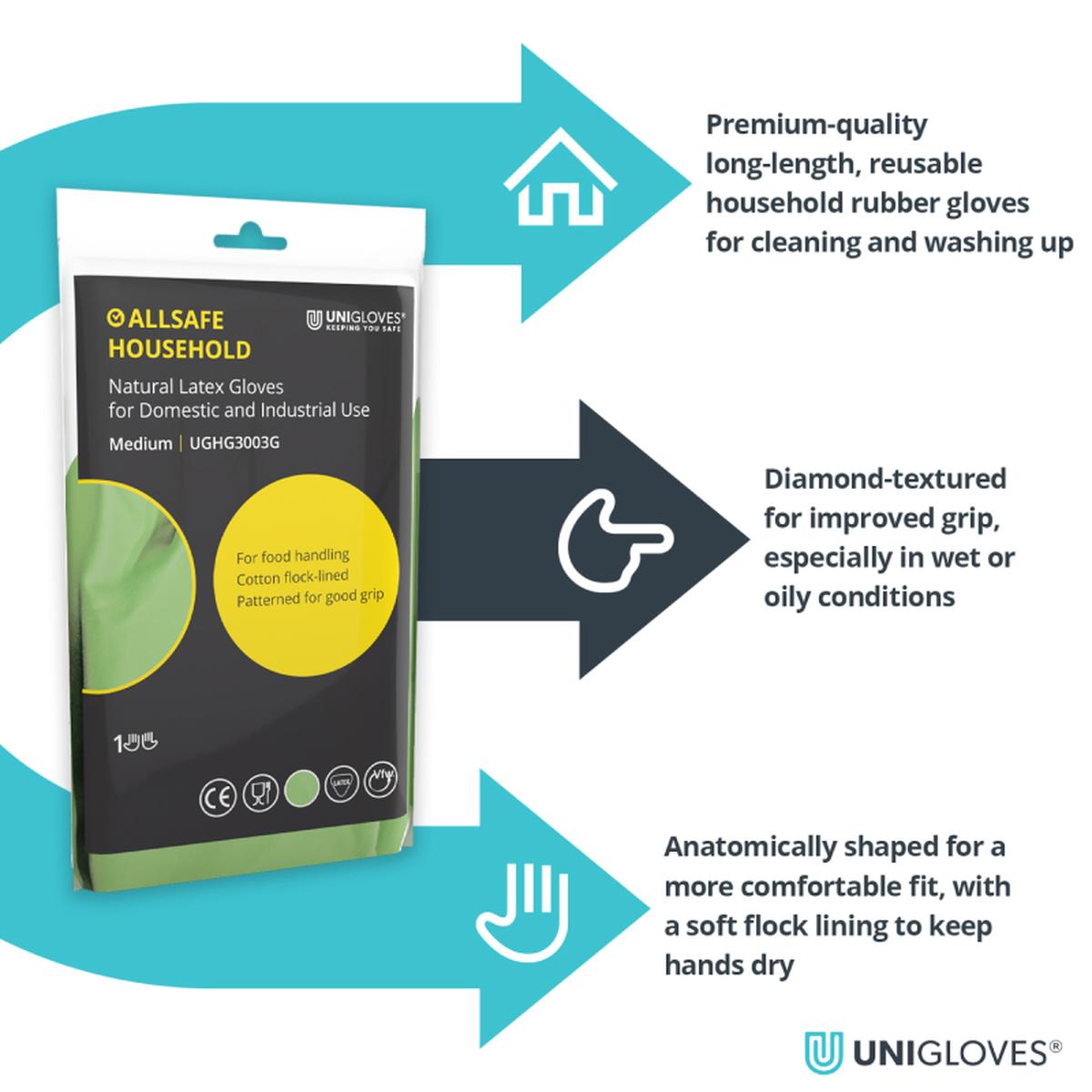 Allsafe Household rokavice so večkratno uporabne lateks rokavice, zasnovane za zaščito pred vodo, detergenti in maščobami. Njihova guma na zunanjosti preprečuje vdor tekočin, medtem ko mehka flisna obloga vpija vlago in ohranja roke suhe.