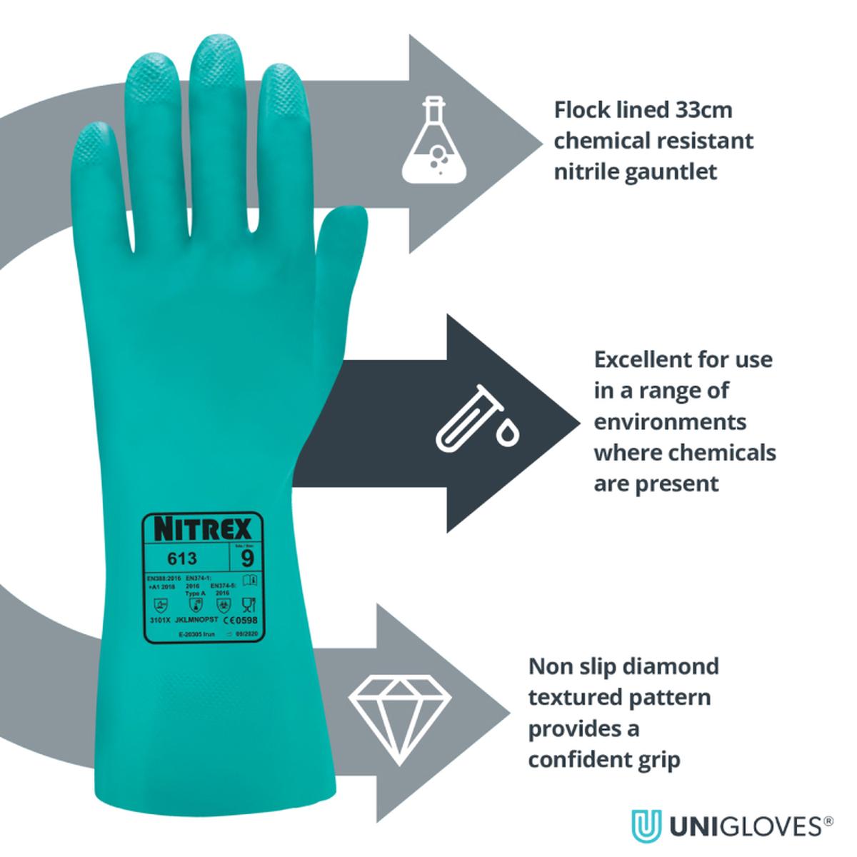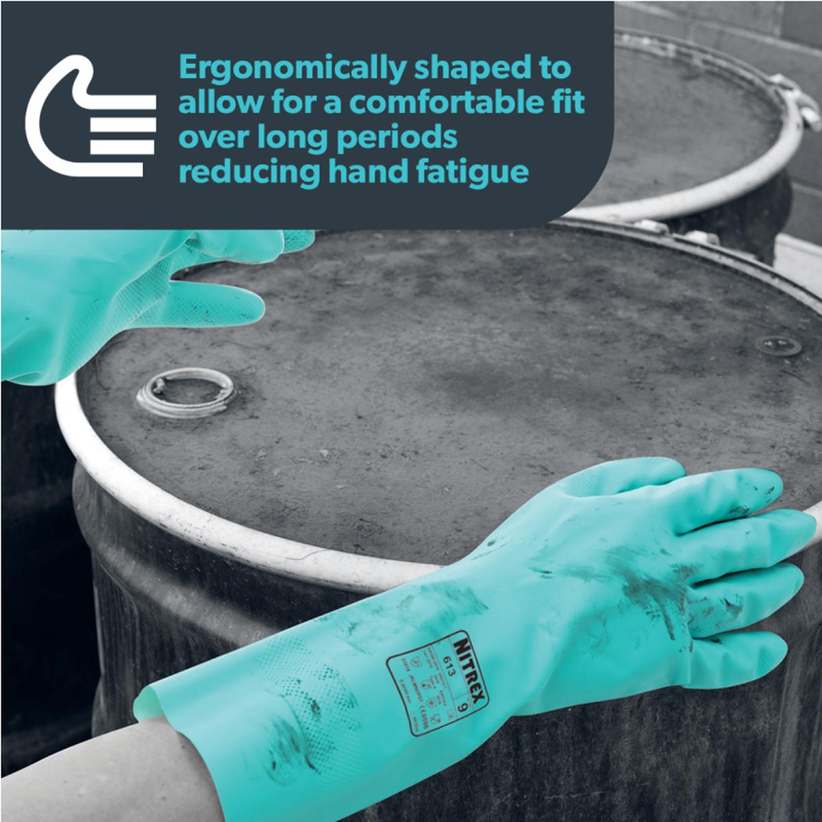 Delovne rokavice Nitrex zagotavljajo zanesljivo zaščito rok pri ravnanju z kemikalijami, močnimi čistili, topili in olji. Zaradi flis podloge so izjemno udobne za nošenje, saj učinkovito ohranjajo suhe roke tudi pri dolgotrajni uporabi.