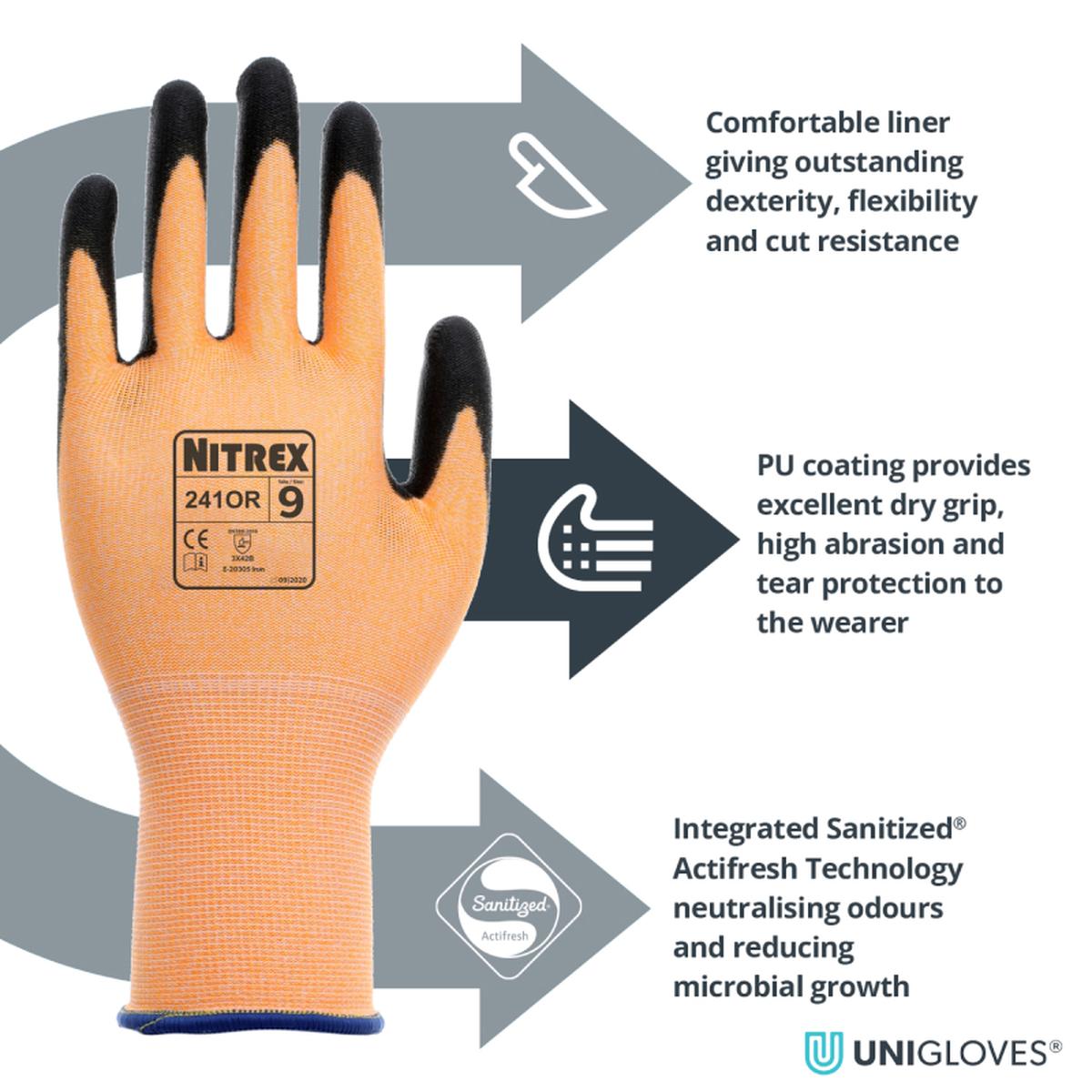 Unigloves Nitrex 241OR so idealna izbira za delovna mesta, kjer je potreben dober oprijem, odpornost proti obrabi in zaščita pred nizkimi tveganji ureznin – brez kompromisov pri udobju in spretnosti rok.