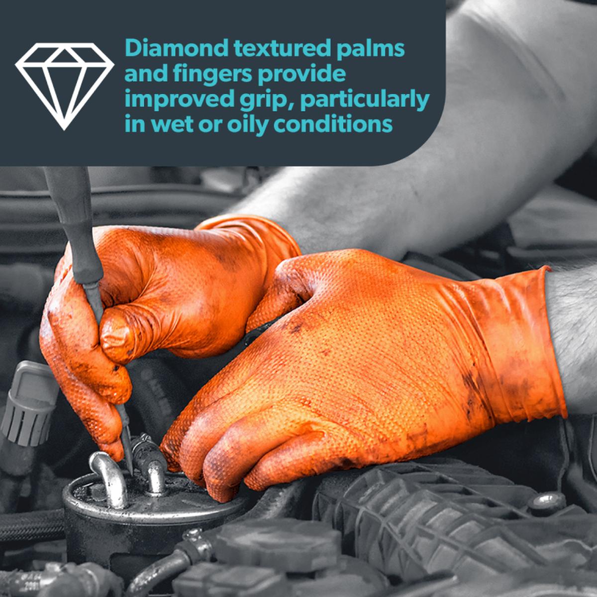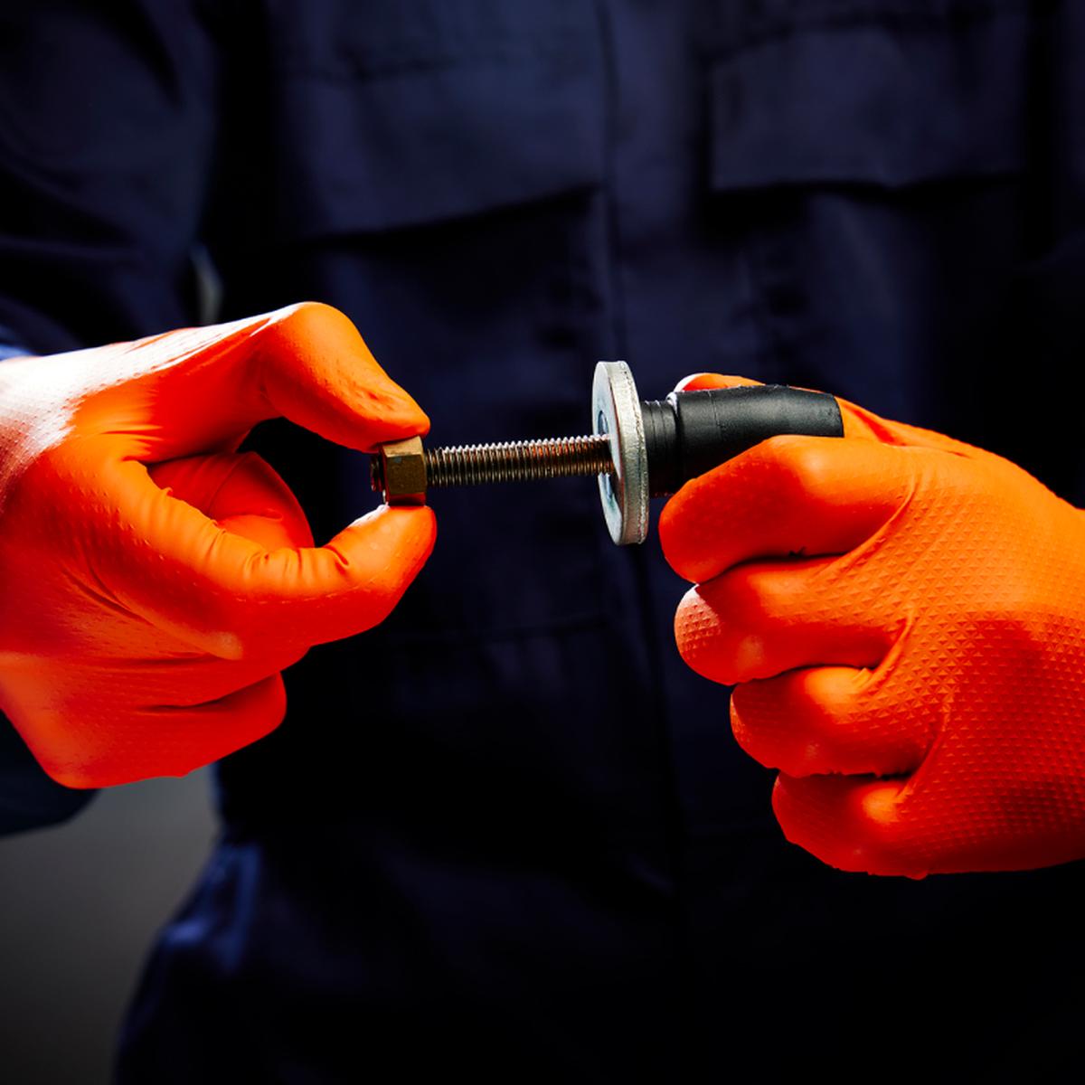 Nitrilne rokavice PRO.TECT Orange HD so rokavice za enkratno uporabo, zasnovane za profesionalna delovna okolja, kjer sta pomembna zanesljiva zaščita in dober občutek pri delu. Teksturiran vzorec na dlani izboljša oprijem, nitrilni material pa se med uporabo prilagodi roki in omogoča natančno delo tudi pri daljšem nošenju.