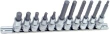 <b>5 Steckschlüssel-Einsätze Außensechskant 60 mm lang</b> 5 | 6 | 8 | 10 | 12 mm<br/><b>6 Steckschlüssel-Einsätze Außensechskant 100 mm lang</b> 5 | 6 | 7 | 8 | 10 | 12 mm<br/><b>1 Stecknuss-Schiene</b>