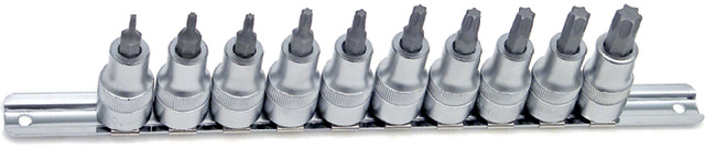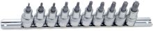 <b>10 Steckschlüssel-Einsätze TORX<sup>®</sup></b> T10 | T15 | T20 | T25 | T27 | T30 | T40 | T45 | T50 | T55<br/><b>1 Stecknuss-Schiene</b>