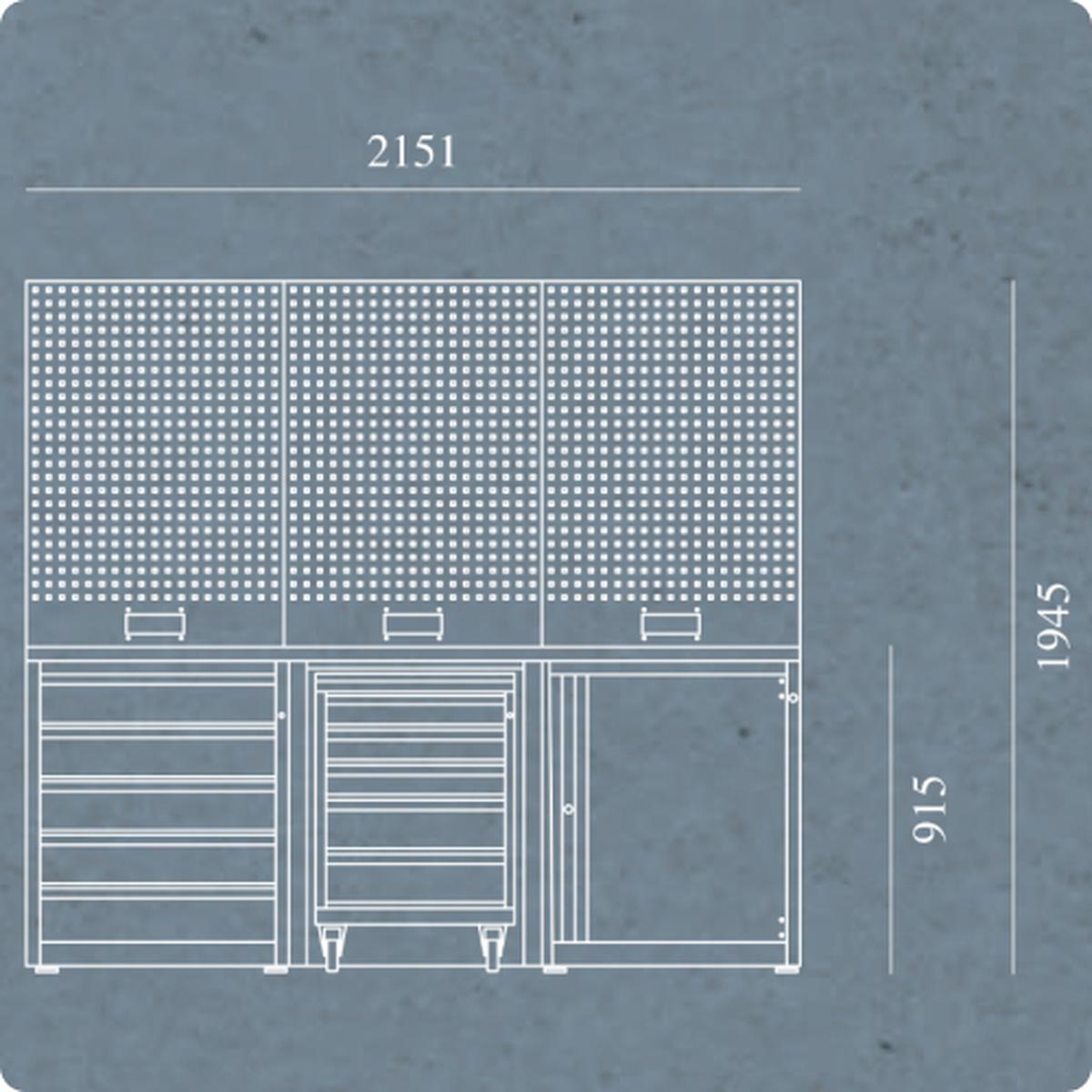 Sestav dimenzij 2151 x 740 x 1945 mm vključuje tudi mobilni delavniški modul, kar omogoča večjo mobilnost in prilagajanje poteku dela.