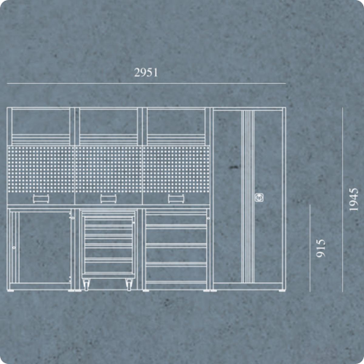 Sestav z dimenzijami 2951 x 740 x 1945 mm je najobsežnejši v liniji Smart Plus in vključuje tako mobilne kot statične module za popolno prilagodljivost vašim delovnim navadam.