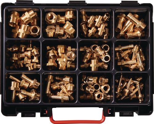 Praktična sortirna škatla z 120 medeninastimi deli. Idealna za delavnice in montažo.