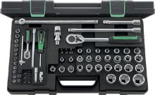 <b>Inhalt 1/4"</b><br/> <b>9 Steckschlüssel-Einsätze Sechskant</b> 4 | 5 | 5,5 | 6 | 7 | 8 | 9 | 10 | 11 mm<br/> <b>5 Steckschlüsseleinsätze TORX<sup>®</sup></b> E4 | E5 | E6 | E7 | E8<br/> <b>3 Schraubendreher-Einsätze Außensechskant</b> 3 | 4 | 5 mm<br/> <b>6 Schraubendreher-Einsätze TORX<sup>®</sup></b> T8 | T9 | T10 | T15 | T20 | T25<br/> <b>1 Umschaltknarre</b> 22 Zähne<br/> <b>2 Verlängerungen</b> 54 | 150 mm<br/> <b>1 Quergriff<br/> 1 Steckgriff<br/> 1 Kardangelenk</b><br/> <br/> <b>Inhalt 1/2"</b><br/> <b>10 Steckschlüssel-Einsätze Sechskant</b> 13 | 16 | 17 | 18 | 19 | 21 | 22 | 24 | 27 | 30 mm<br/> <b>7 Steckschlüsseleinsätze TORX<sup>®</sup></b> E10 | E12 | E14 | E16 | E18 | E20 | E24<br/> <b>5 Schraubendreher-Einsätze Außensechskant</b> 6 | 8 | 10 | 12 | 14 mm<br/> <b>7 Schraubendreher-Einsätze TORX<sup>®</sup></b> T27 | T30 | T40 | T50 | T55 | T60<br/> <b>1 Umschaltknarre</b> 36 Zähne<br/> <b>2 Verlängerungen</b> 130 | 255 mm<br/> <b>1 Quergriff<br/> 1 Kardangelenk</b>