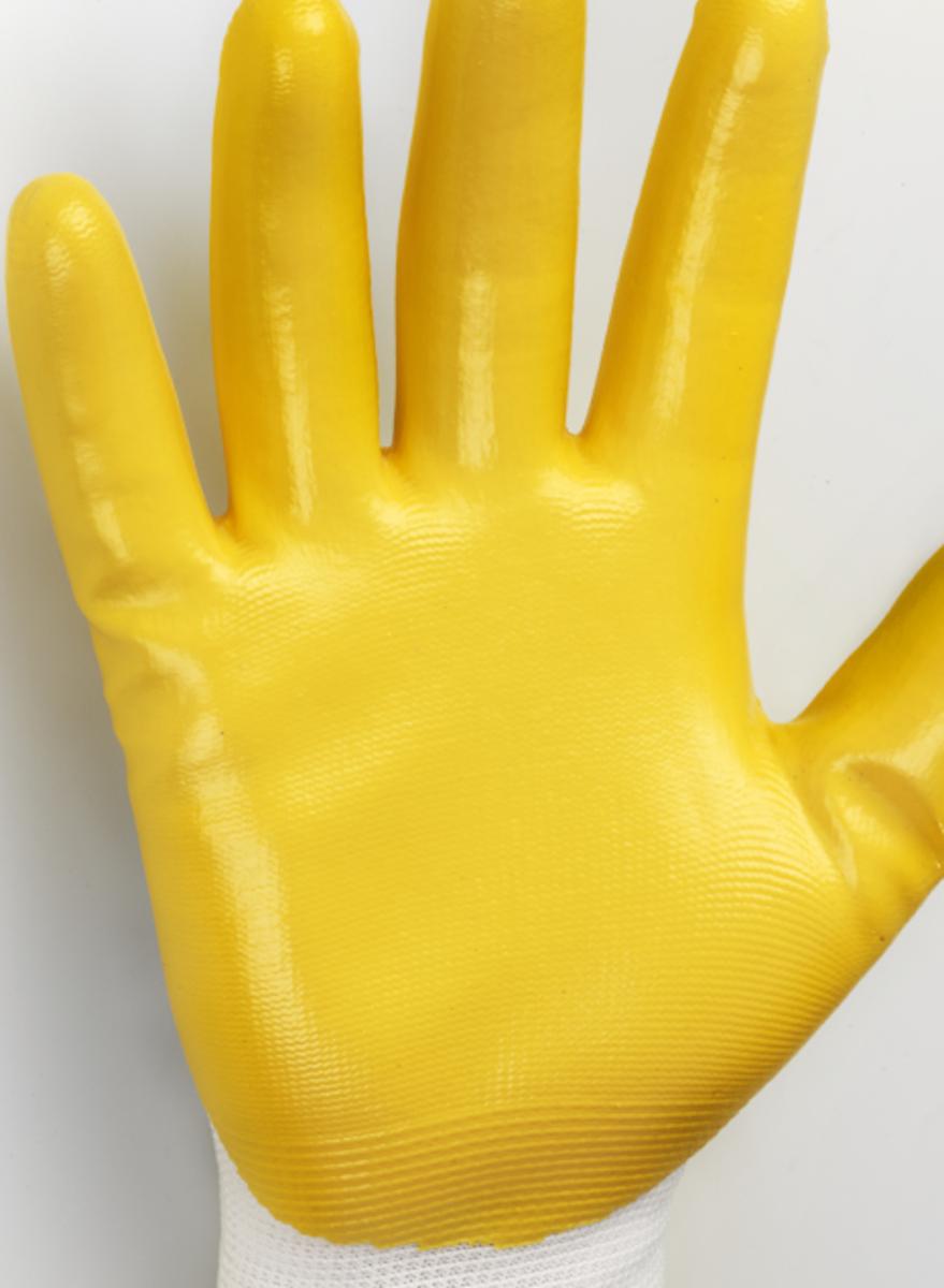 Rokavice so pletene v 13 gg gostoti in imajo podlogo iz trpežnega poliestra, kar omogoča dobro prileganje in zračnost. Zaradi svoje jasne barvne sheme v beli in rumeni barvi so enostavno prepoznavne in primerne tudi za uporabo v okoljih, kjer je preglednost pomembna.