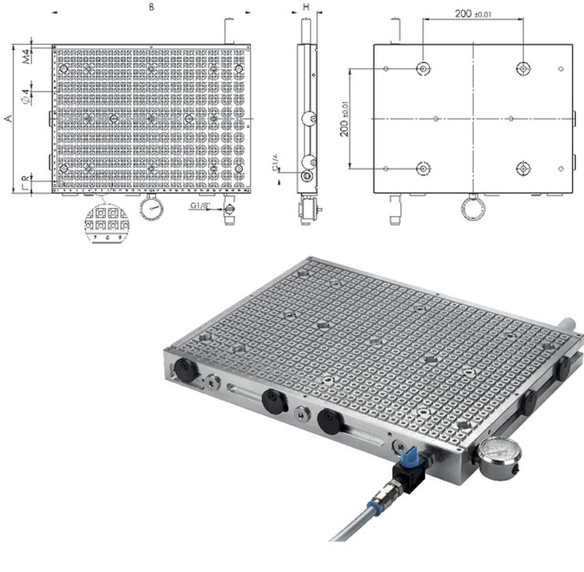- durch seitliche Nuten oder die Befestigungsbohrungen (für M8) kann die Vakuumspannplatte auf einer Grundplatte (z. B. Maschinentisch) befestigt werden