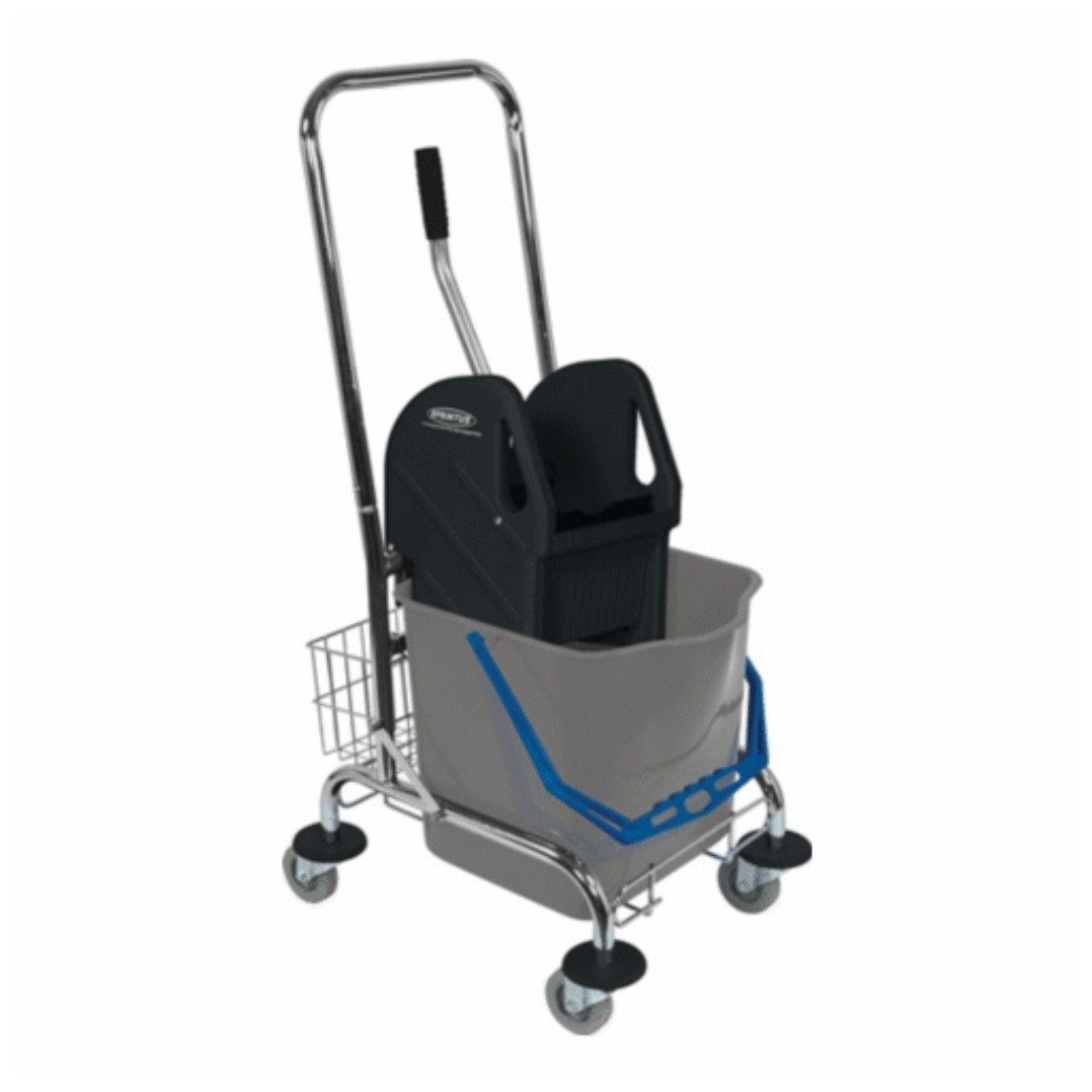 Profesionalni voziček za pomivanje tal z 35-litrskim enojnim vedrom in vzdržljivim ožemalnikom iz umetne mase je idealna izbira za vse, ki iščejo učinkovito in prostorsko varčno rešitev. Opremljen je s potisnim ročajem za udobno upravljanje, odbojnimi diski za zaščito sten in pohištva ter vrtljivimi gumiranimi kolesi za enostavno premikanje tudi v ozkih prostorih. Praktična odlagalna košara omogoča shranjevanje čistilnih pripomočkov med delom.