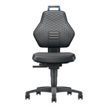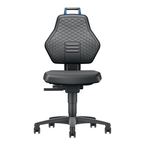 Ergonomsko oblikovan vrtljiv stol je odlična izbira za delavnice, tehnične pisarne in industrijska okolja. Opremljen je z oblazinjenim sedežem in naslonjalom iz umetnega usnja, kar zagotavlja udobje tudi pri dolgotrajnem sedenju. Stol omogoča nastavitev globine in naklona sedeža za optimalno prilagoditev telesu. Inovativen ročaj na naslonjalu nudi možnost za priročno obešanje nahrbtnika, jakne ali zaščitne opreme. Kolesa z avtomatsko zavoro glede na obremenitev omogočajo varno uporabo brez zdrsa.